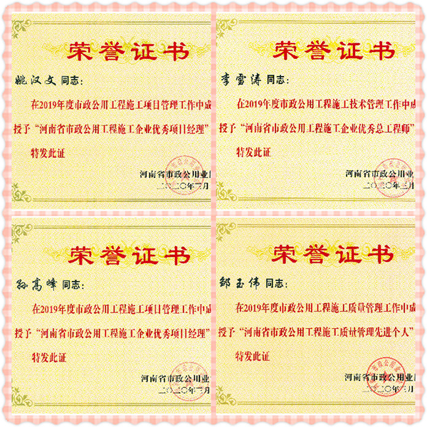 除省金杯獎(jiǎng)之外,公司承建的中心城區(qū)浉河兩岸排污口過(guò)渡性污水污水二期工程二標(biāo)段被評(píng)為“河南省市政優(yōu)良工程”,平橋區(qū)平東路(浉河北路-平橋大道)新建工程(二標(biāo)段)被評(píng)為2019年度“市政工程省級(jí)安全文明工地”。